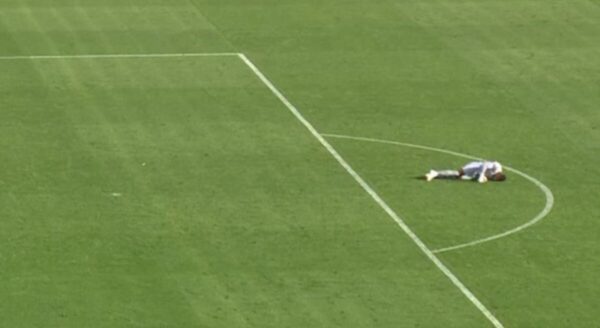 Vārtsargs 30. minūtē spēlē pret Ekvatoriālās Gvinejas izlasi nokrita uz laukuma pie vārtsargu teritorijas robežas.